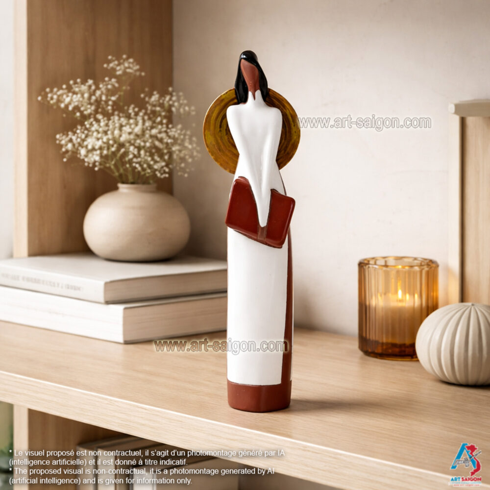 Cette statuette en terre cuite représente une jeune lycéenne vietnamienne vêtue d’un “áo dài” blanc traditionnel. Un “nón lá” est attaché dans son dos, tandis qu’elle tient entre ses main une sacoche de style ancien. Ses cheveux noirs, longs et lâchés jusqu’aux épaules, complètent l’allure douce et élégante.